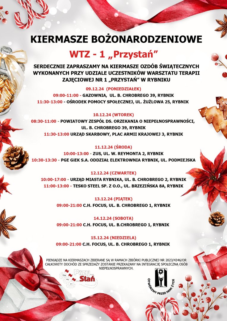 Serdecznie zapraszamy na Kiermasze Bożonarodzeniowe WTZ - 1 "Przystań"!