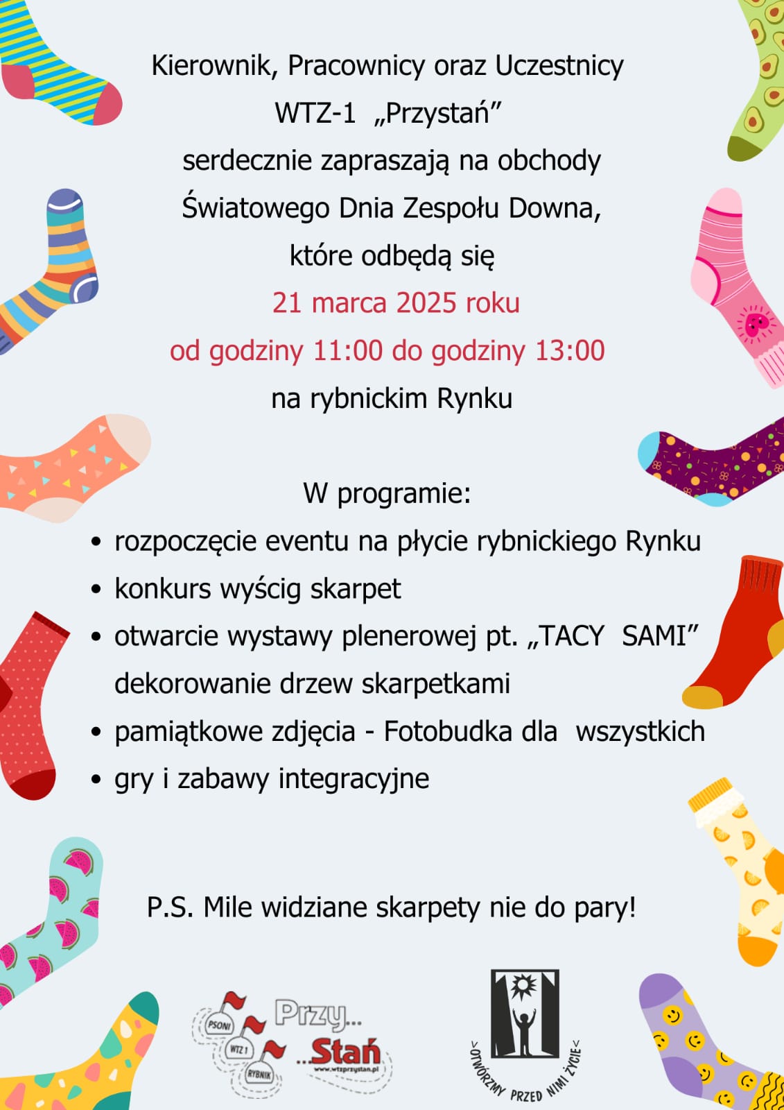 11/03/2024 Światowy Dzień Zespołu Downa Kierownik, Pracownicy oraz Uczestnicy WTZ-1 "Przystań" serdecznie zapraszają na obchody 21 marca 2025 roku od godziny 11:00 do godziny 13:00 na rybnickim Rynku